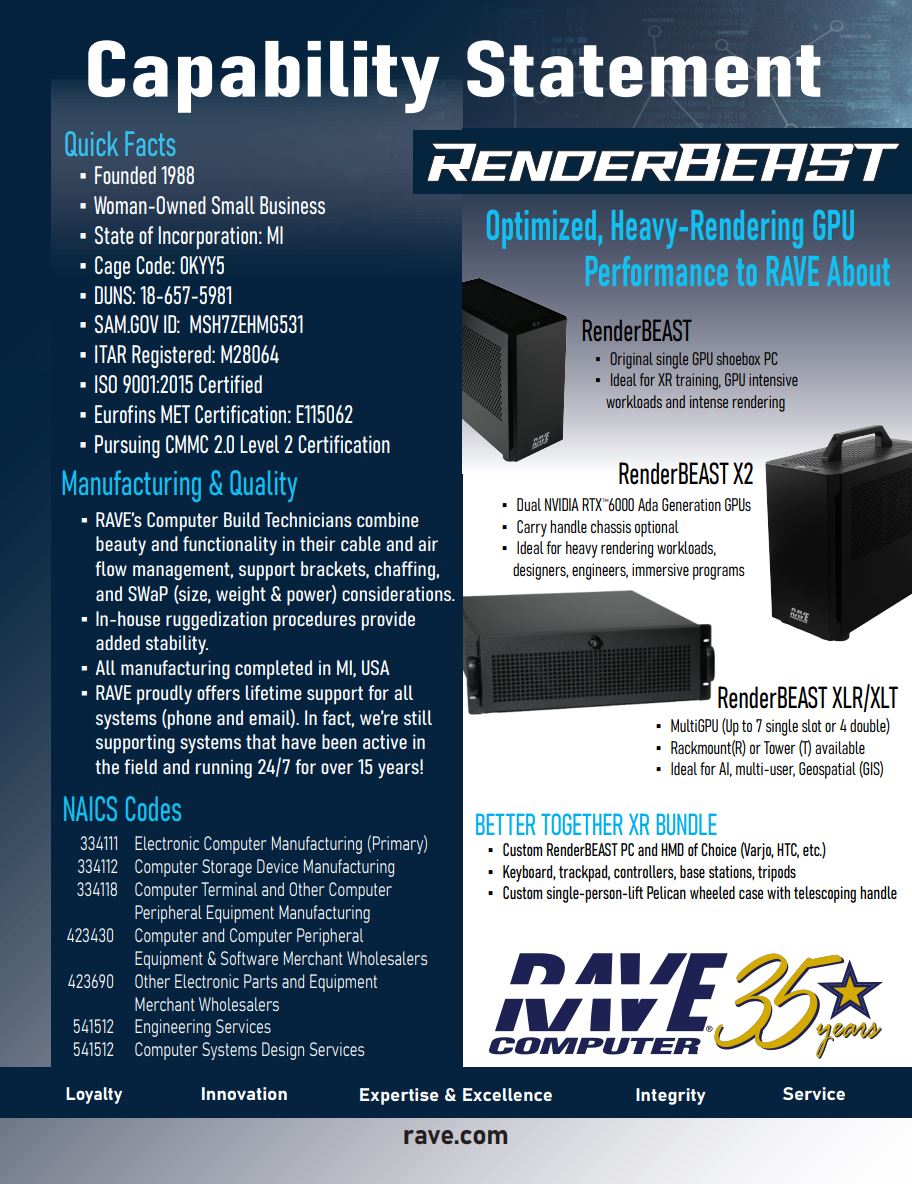 Founded in 1988, RAVE Computer is a computer hardware manufacturer headquartered in the Metro-Detroit, MI area. We are a woman-owned small business with over 35 years of experience designing, optimizing, and building reliable compute solutions.