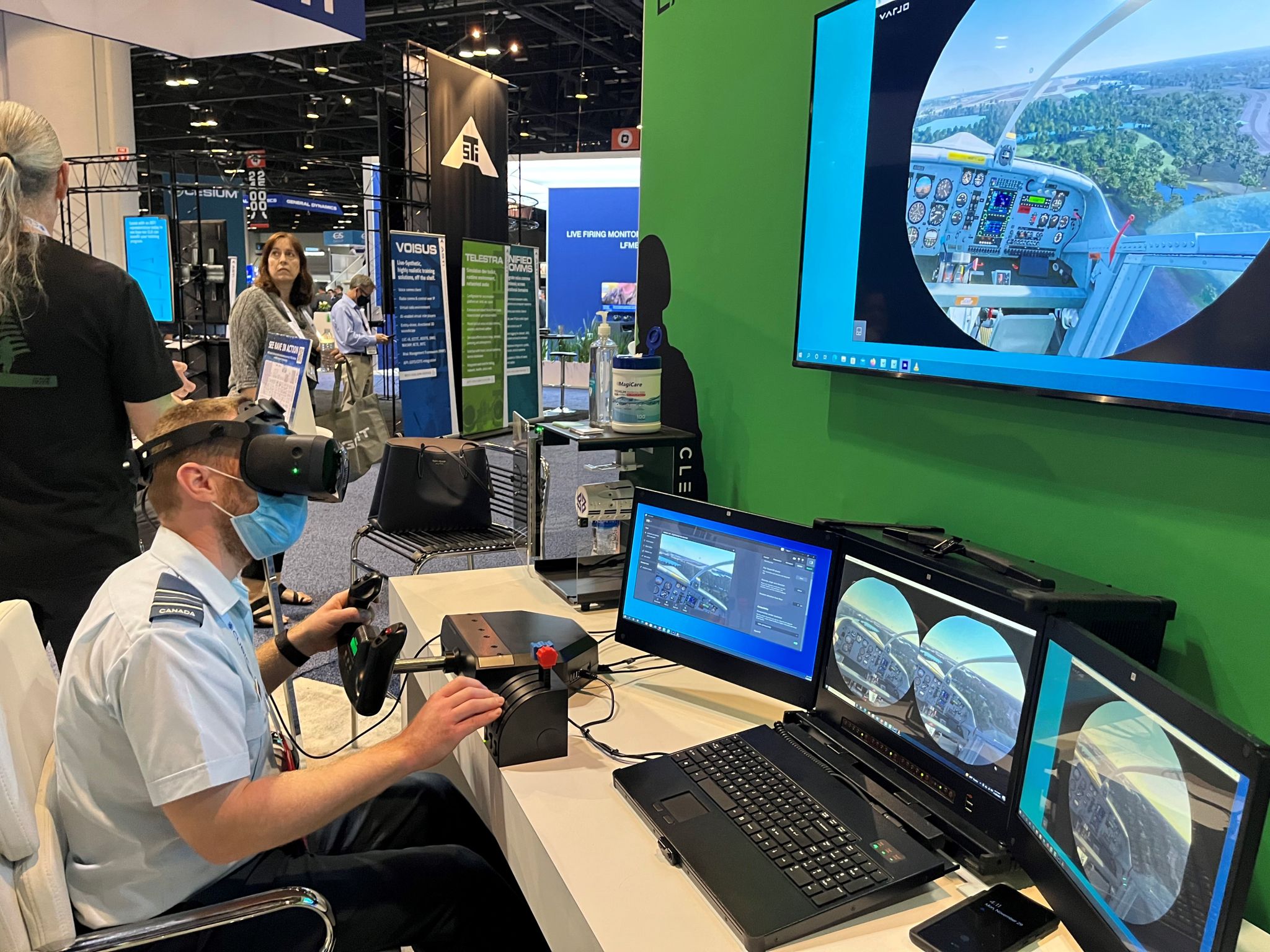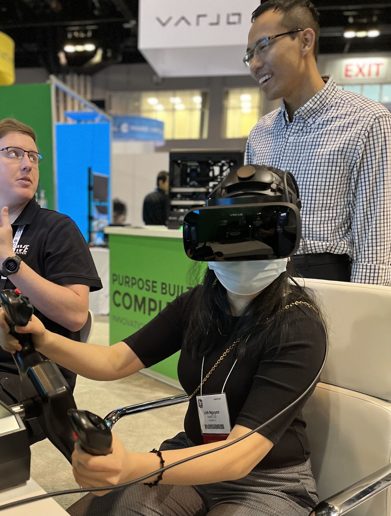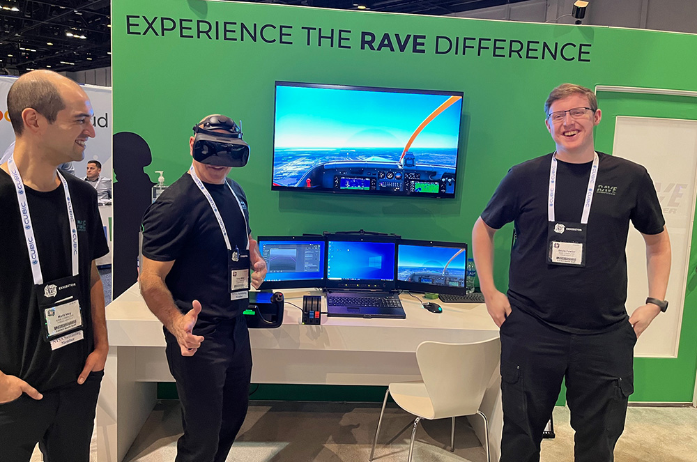 The Varjo Aero professional series headset provides a 360 degree virtual view. The RAVE tri screen provides a wide screen view as well as the compute that drives the visual simulation. The demo uses Microsoft Flight Simulator software.